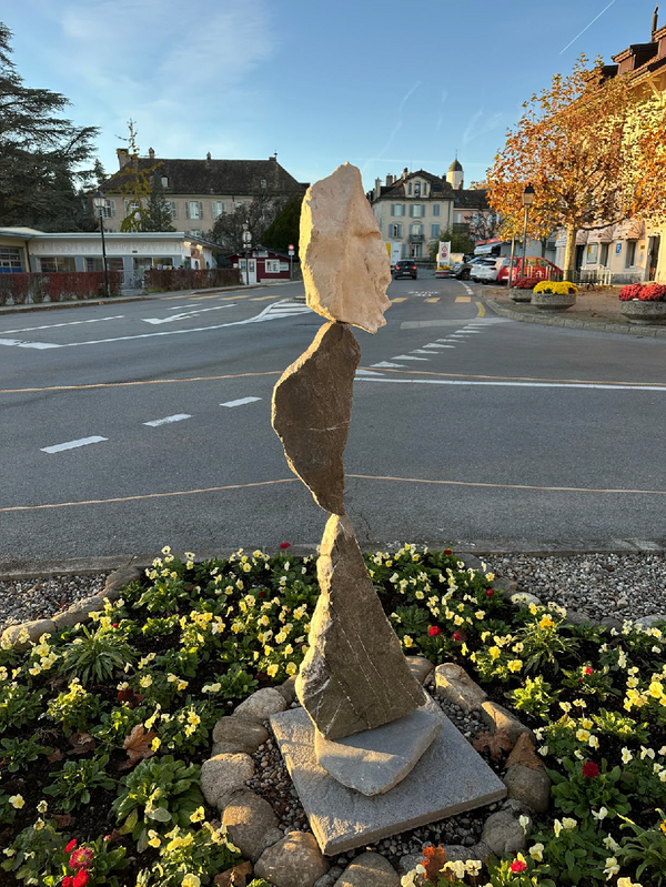 Actuellement à Aubonne, vous pouvez découvrir cinq œuvres intitulées « Les Vigilants », d’environ 1,50 mètre de haut, réalisées à partir de pierres locales et installées dans les massifs fleuris à proximité du Pressoir.